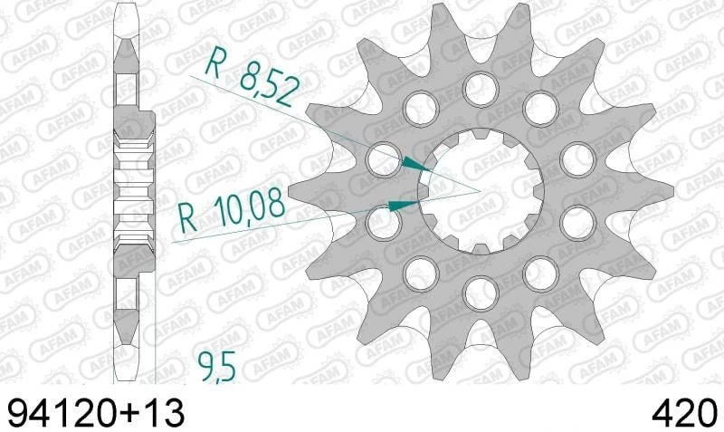 Een stalen 13 tands AFAM voortandwiel. De tandwielen van AFAM zijn gemaakt van C45 staal met inductie geharde tanden, het tandprofiel is concentrisch, plat en perfect rond. Door deze samenstelling zijn de AFAM tandwielen perfect ter vervanging of zelfs ter verbetering van de OEM tandwielen.