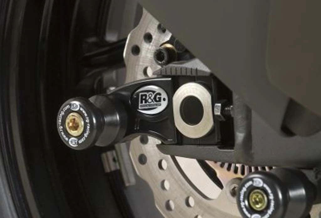 Wanneer er geen schroefdraad in de achterbrug is om een bobbin te monteren kan de R&G “Offset Cotton Reels” gebruikt worden. Zo kan er via de kettingspanner/achteras toch een bobbin op de motor gemonteerd worden en kan de motor dus met een paddockstand veilig en stevig gestald worden. Ook beschermen de bobbins de achterbrug bij een val.